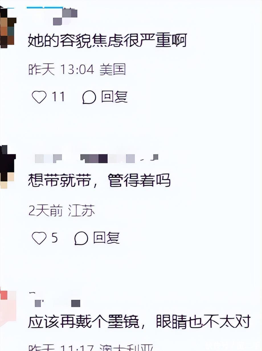 对此有网友表示她的“包袱”和容貌焦虑太严重了,但其实人家戴不戴口罩是人家自己的事情,不一定是容貌焦虑。还有眼尖的网友发现她的眼睛出现了问题,有一只眼睛大一只眼睛小,并且她的左眼似乎很难睁开。